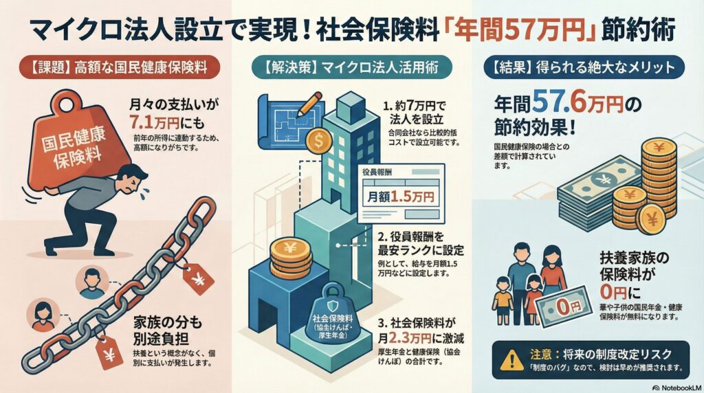 これで、私本人の社会保険料を払うだけで、被扶養者である妻の国民年金、健康保険料が無料、子供の健康保険料が無料(国民年金は学生特例で納付猶予)になります。私の場合、もし、国民年金と国民健康保険にしていたら、毎月7.1万円もかかります。つまり、年間で57.6万円(法人税込で50万円)も節約できる計算です。