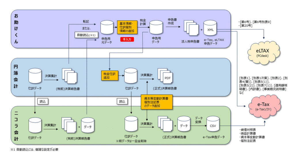 - 🟩ニコラ会計の仕訳データを🟪お助けくんに読み込む。または、🟦円簿会計の貸借対照表、損益計算書から手入力で🟪お助けくんに転記する(この場合は、手順2, 3はスキップ可能)。