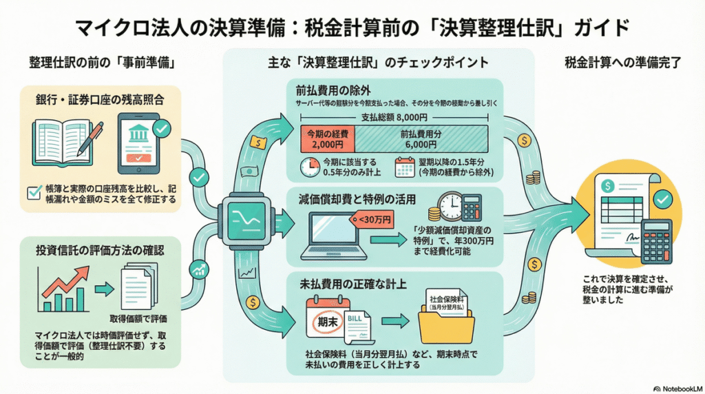 証券口座で保有している投資信託については、決算時に時価評価をする場合、整理仕訳が必要になりますが、マイクロ法人では時価評価せず、取得価額で評価することが圧倒的に多いです。(その方が楽)したがって、整理仕訳は行いません。