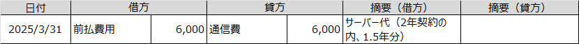 サーバー代・ドメイン代・保険料などで翌期分以降(1年以上)の費用を今期に支払っている場合、今期の経費から除外します。下記の仕訳の場合、サーバー代として、2年分8,000円を支払ったが、期末で残り1.5年分残っているので、支払額の4分の3(6,000円)を前払費用に計上します。