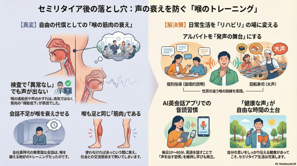 セミリタイア生活が半年ほど続いた頃、私は自分でも予想だにしなかった「異変」に直面することになりました。それは、誰の身にも起こりうる、けれど多くの人が見落としている「自由の代償」でした。今回は、私の喉に起きたトラブルと、そこから学んだ「声を出すこと」の重要性について、等身大のエピソードをお届けします。